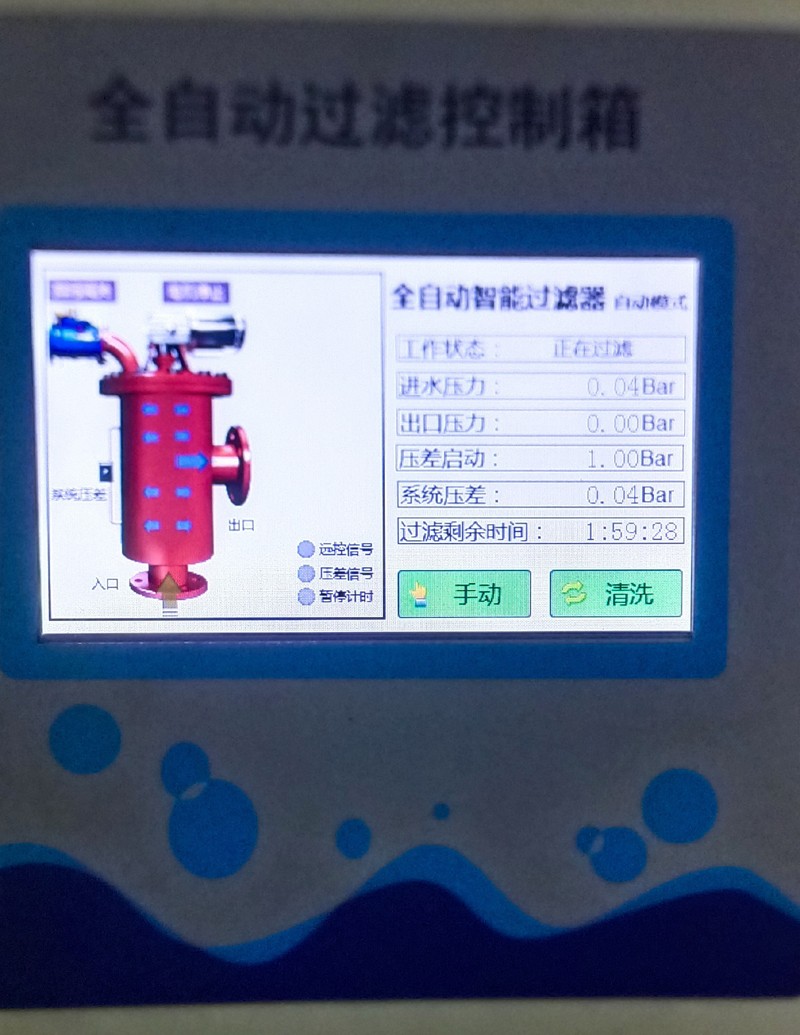 自動控制:自動控制有定時和壓差兩個方式。在過濾時間定時器上設(shè)定過濾時間,當過濾時間到,啟動排污,排污時間由排污時間定時器設(shè)定;同時控制系統(tǒng)實時將系統(tǒng)壓差與用戶設(shè)定的壓差相比較,當系統(tǒng)壓差達到設(shè)定壓差時,過濾器也進行清洗排污,排污時間由排污時間定時器設(shè)定。排污時間到,停止清洗,系統(tǒng)恢復至其初始狀態(tài),為下一個過濾工序作好準備。